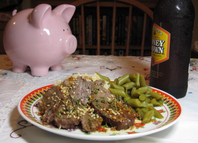Here's a frugalization of the Sesame-Garlic Sirloin Steak from the book my wife checked out of the library last week, Cooking for Two: Efficient and Delicious Meals.